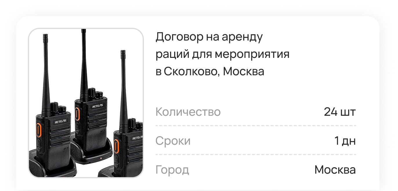 Вы можете арендовать от 1 до 70 раций одновременно для оперативных решений вопросов на вашем мероприятии